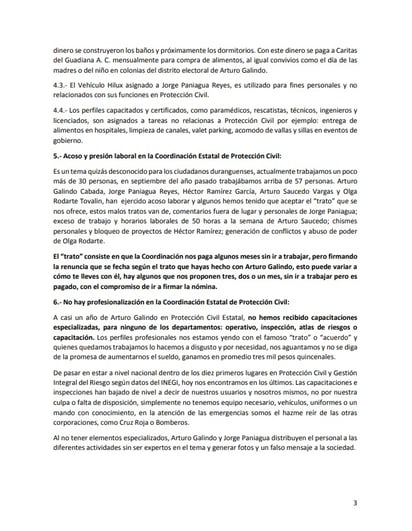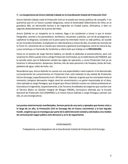 “Arturo Galindo es un inexperto en la materia, llega a los accidentes a tomar o que le tomen fotografías, estorba a los paramédicos, bomberos, rescatistas y policías. No cuenta con una especialidad a nivel superior ni ha demostrado curricularmente los conocimientos en Protección Civil, violando la Ley estatal de Protección Civil en Durango, específicamente el art. 49 fracción V”, sentencia el texto firmado por trabajadores y exelementos de la CEPC Durango.