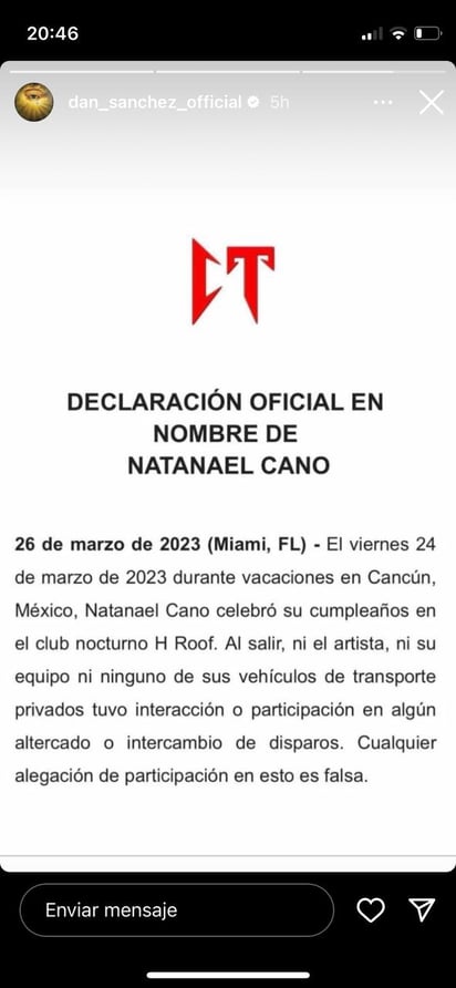 Cano recurrió a sus redes para postear un par de mensajes donde pedía perdón y aseguraba que había sido involucrado en algo que él no había hecho. "Me arruinaron mi cumpleaños por algo que ni hice. Ni modo. Una disculpa a mi gente de Cancún", escribió junto a una foto en la que aparece la mitad de su rostro.