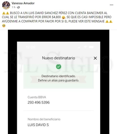 A través de redes sociales, una duranguense pide la colaboración de la ciudadanía para localizar a un cuentahabiente de BBVA al que le transfirió por error.
