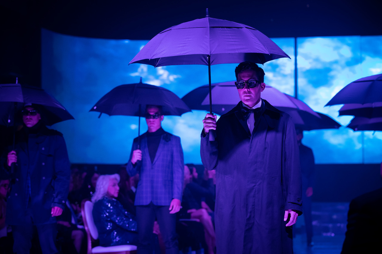 La velada comenzó con una fuerte tormenta, recreada con un juego de luces azules y violetas, sonidos de lluvia y truenos y múltiples rayos proyectados en una gran pantalla al fondo de la pasarela, por la que empezaron a desfilar modelos con la elegante colección para caballeros, resguardada del mal tiempo con paraguas.