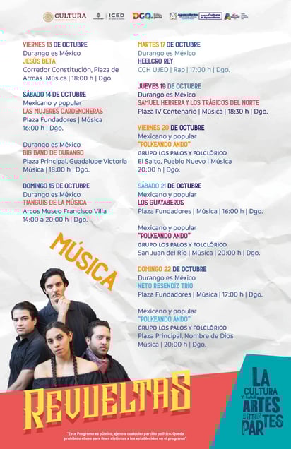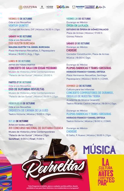 En el programa oficial dado a conocer por el Instituto de Cultura del Estado de Durango (ICED), se especificaron las fechas y locaciones donde diversos artistas, no solo de esta ciudad, sino de diferentes partes de la República, participan.