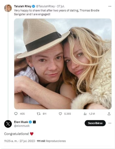 De entre las decenas de felicitaciones sobresalió un comentario de Elon Musk, quien celebró la nueva relación sentimental de Riley y no dudó en hacer público el afecto que guarda por ella.