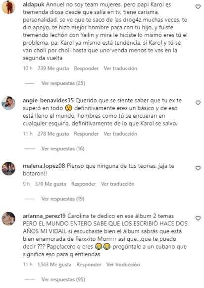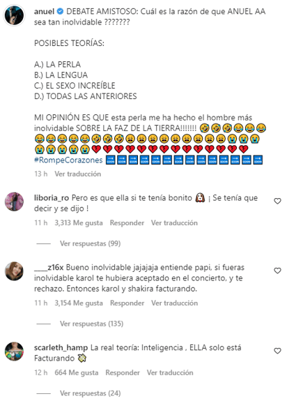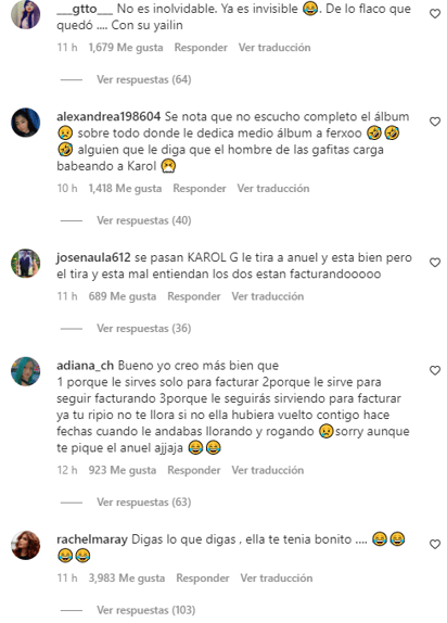 La publicación de Anuel, atrajo a muchos usuarios que principalmente, hacían referencia a la artista colombiana, quien aseguran que en la mayoría se sus nuevas canciones hace referencia al reguetonero, Feid, con quien aseguran lleva un tiempo saliendo.