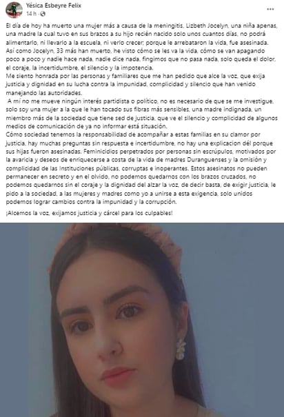 "Hoy ha muerto una mujer más a causa de la meningitis, Lizbeth Jocelyn, una niña apenas, una madre la cual tuvo en sus brazos a su hijo recién nacido solo unos cuantos días, no podrá alimentarlo, ni llevarlo a la escuela, ni verlo crecer; porque le arrebataron la vida, fue asesinada", afirmó.
