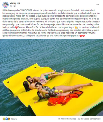 "BIEN dicen que las TRAICIONES vienen de quien menos lo imaginas,esta foto de lo más normal mi hermana yo y mi pareja de paseo porque para todos lados me la llevaba ala que le daba todo lo que me pedía pues se metía con mi esposo y que puedo pensar al respecto es inexplicable porque nunca me hubiera imaginado algo así , esto súpera cualquier sentir mío es simplemente repusilvo para mi ,y no es dolor tanto de la pareja si no de mi hermana mi SANGRE que nunca siquiera me pasaba por la cabeza y me pasó algo que nunca creé iría en fin perdí una pareja y también una hermana ala cual quería y daba todo por ella German Alameños De La Sierra felicidades por tu gran logro y no me importa hacerlo público porque me enteré de esto anoche en su fiesta de cumpleaños y por impulso adrenalina y quien sabe cuantos sentimientos más actué de forma impulsiva Asía ellos haciendo un desmadre y mucha gente dándose cuenta,la vida pone situaciones qe uno nunca imaginaría qe pasara"