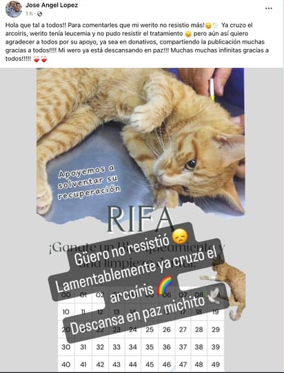 "Quiero agradecer a todos por su apoyo, ya sea en donativos, compartiendo la publicación, muchas gracias a todos!!!! Mi wero ya está descansando en paz!!! Muchas, muchas infinitas gracias a todos!!!!!", declaró en su publicación.
