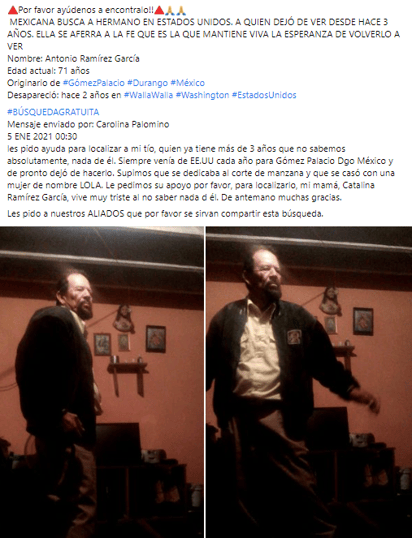 De acuerdo a la información que se tiene, Antonio visitaba a su hermana Catalina cada año, pero dejó de hacerlo sin dar alguna explicación o motivo, razón por la que sus familiares están preocupados, pues no tienen un número para comunicarse y saber si se encuentra bien.