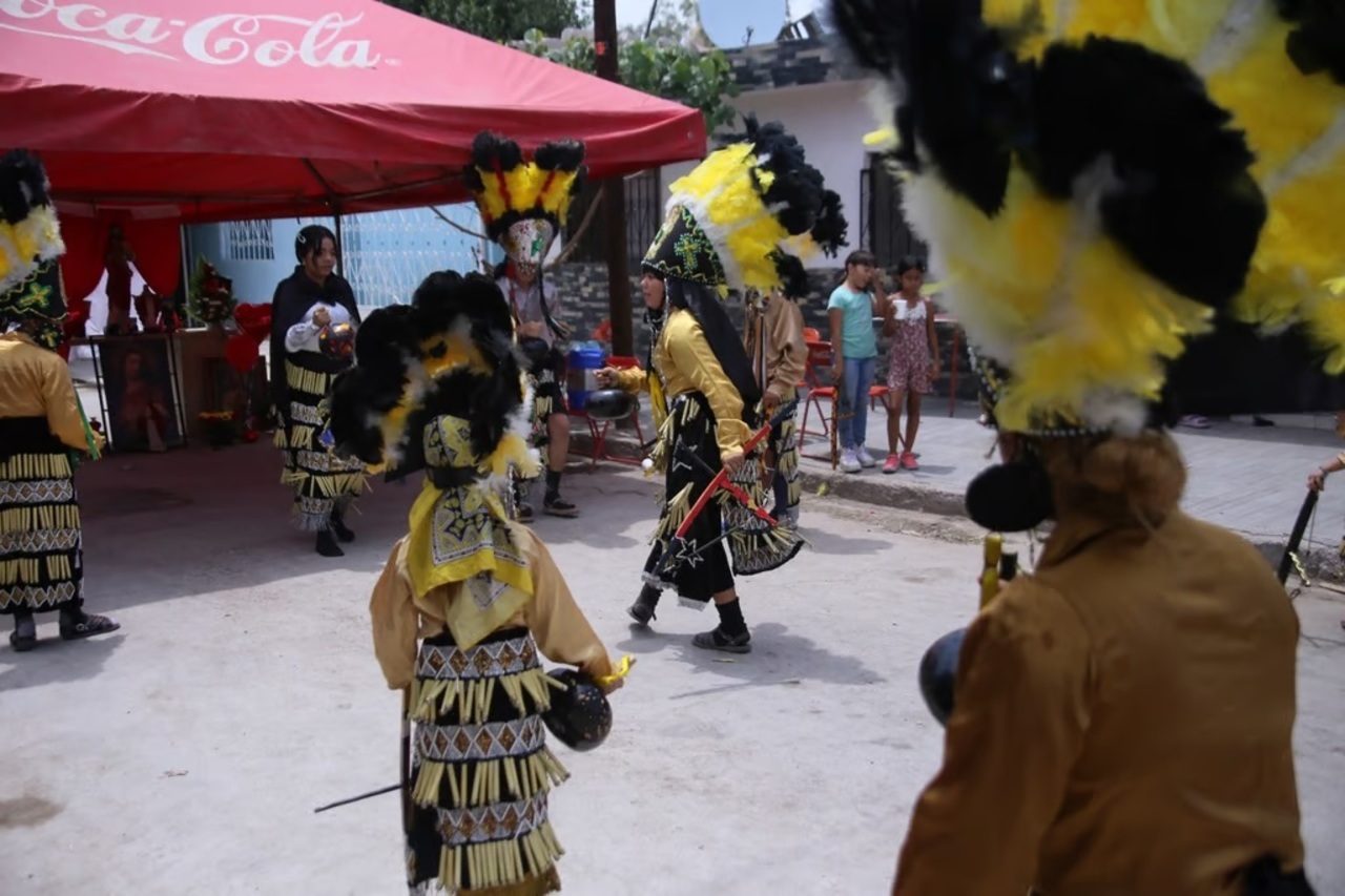 Aunque esto no fue posible y el calor quemaba la piel, la familia se mantuvo frente al altar y a las cazuelas de comida que compartirían con los vecinos de la colonia El Consuelo, de donde son originarios.