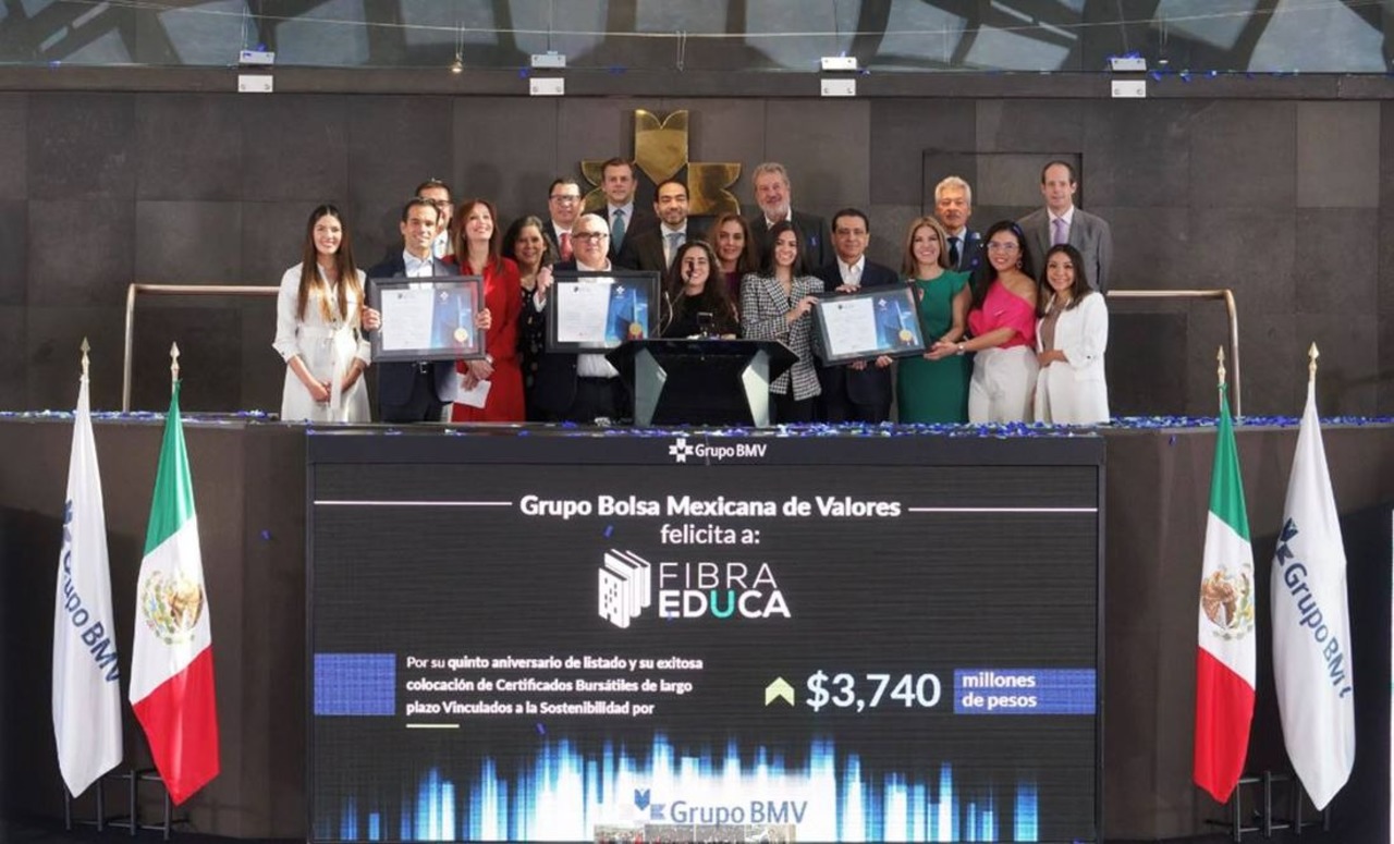 Fibra Educa, fideicomiso de inversión inmobiliaria enfocado en el arrendamiento de planteles educativos en el país, debutó en el mercado de bonos temáticos de la Bolsa Mexicana de Valores (BMV) a través de bonos vinculados a la sostenibilidad, por un monto de 3 mil 740 millones de pesos.