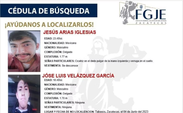 Tras estas medidas de presión, la Fiscalía General de Justicia de Zacatecas informó que el 7 de junio se inició la carpeta por la No Localización de Jesús Arias Iglesias y José Aguilar Rodríguez, de 23 y 18 años de edad, respectivamente, quienes se dedican a la compra y venta de fierro, quienes desaparecieron el 4 de junio cuando se trasladaban a Zacatecas, específicamente al municipio de Tabasco.