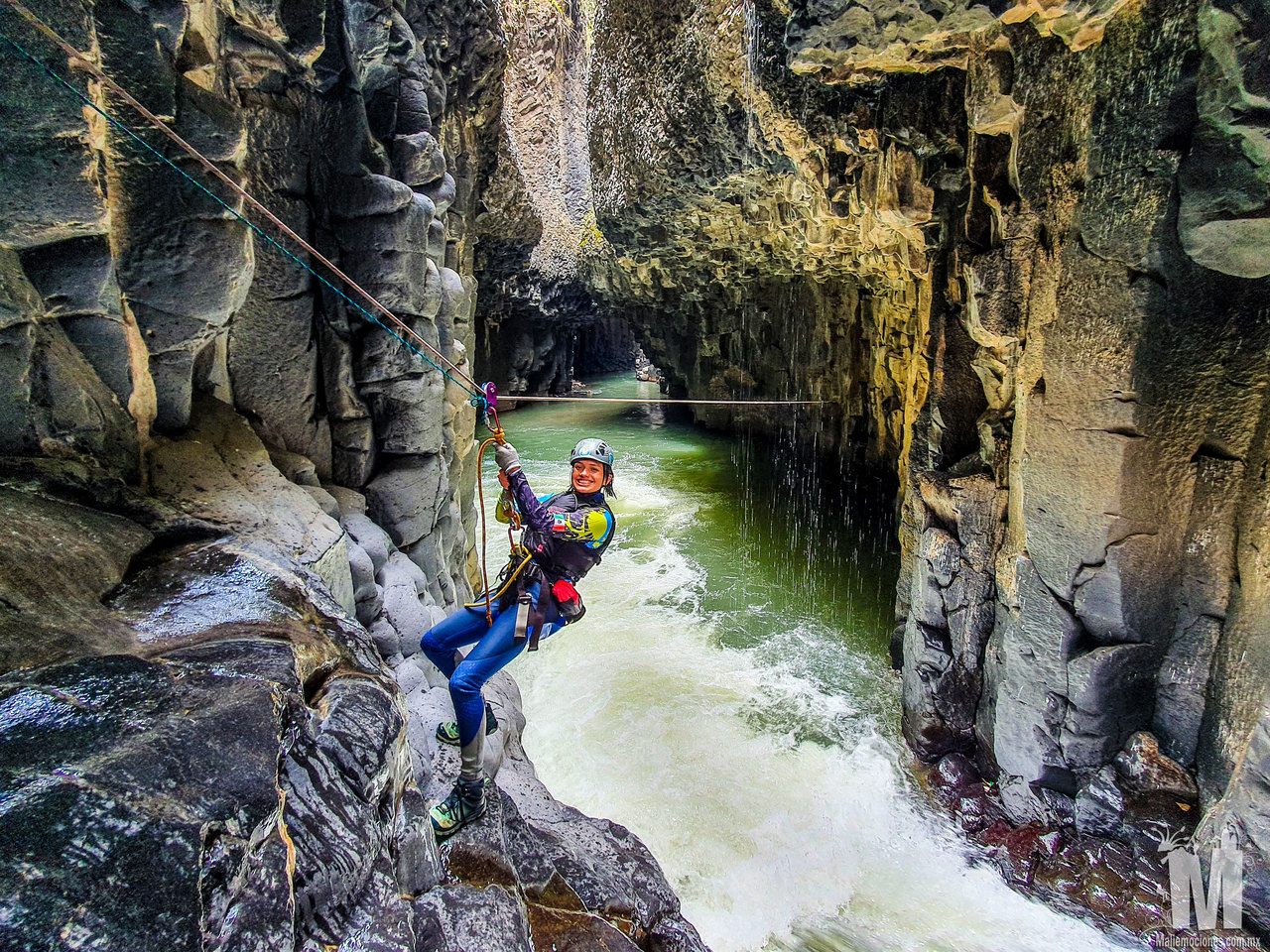 Primero, te dejarás llevar por los dos rebujos o toboganes naturales, donde el equipo de guías se asegura de que vayas bien sujeto y da las indicaciones para deslizarte. Un guía te acompaña hasta casi lanzarte y otro te espera una vez que sales del agua.