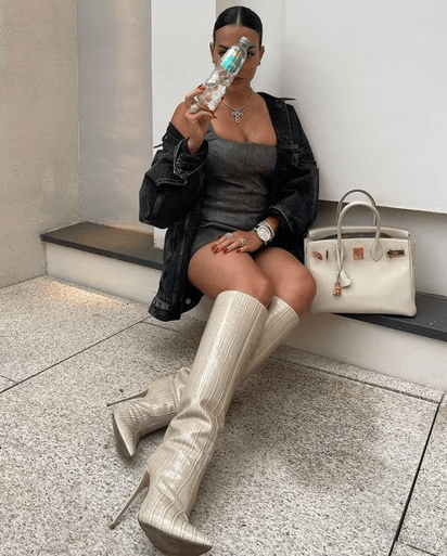 El look de Georgina, aprobado por su estilista Dav Martens, se completa con una chaqueta de jean y botas bucaneras en color marfil.