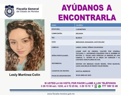 La Fiscalía General de Justicia de la Ciudad de México (FGJCDMX) informa que detectives de la Policía de Investigación (PDI), junto con personal de la Fiscalía General de Justicia del Estado de Guerrero (FGE), localizaron en el municipio de Huitzuco de los Figueroa, el cuerpo de una mujer con características similares al de la joven Lesly Martínez, cuyo paradero se desconoce, tras ser vista por última vez en la alcaldía Álvaro Obregón.