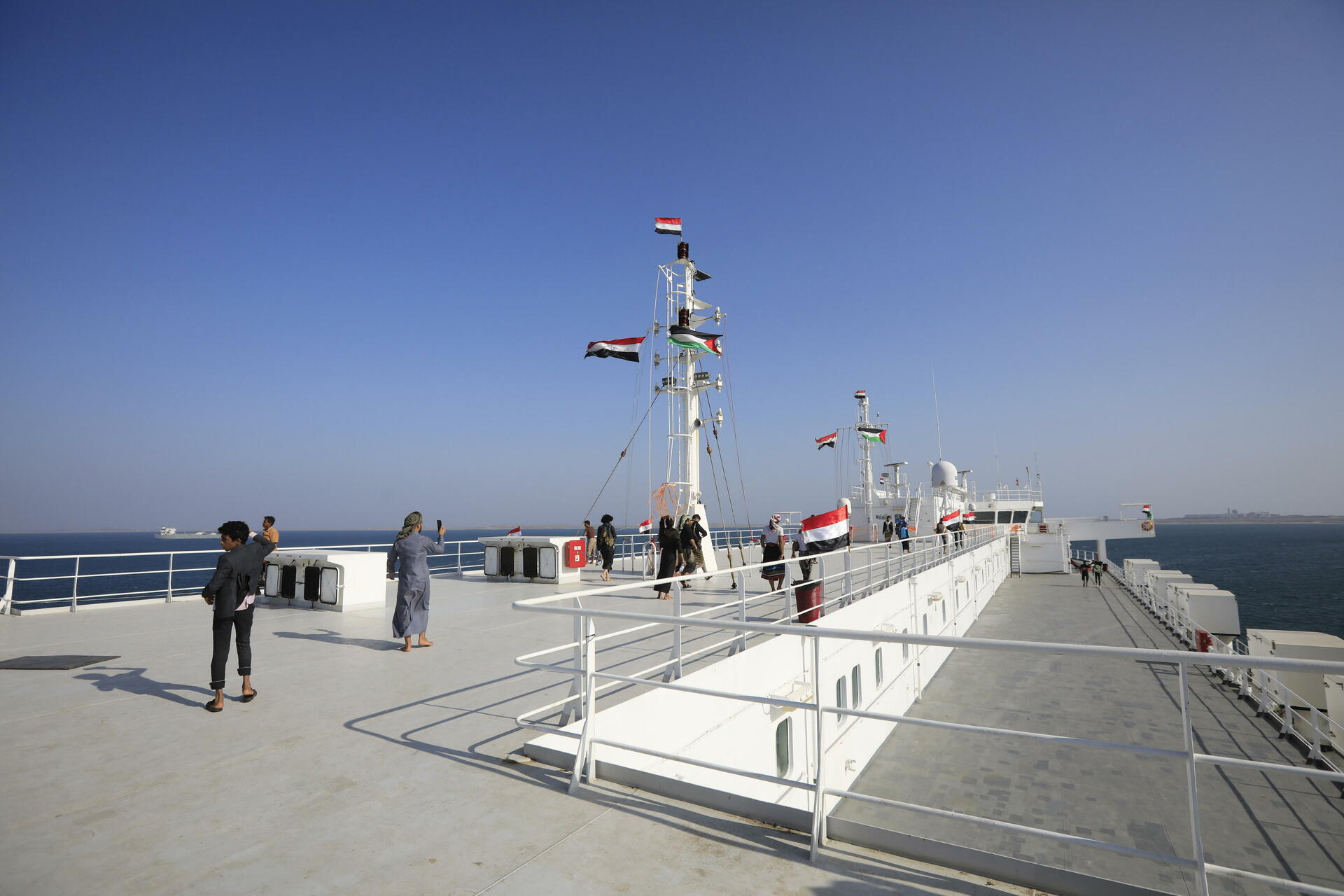 Los combatientes hutíes que custodian el barco de 189 metros de eslora y 32 de manga son los encargados de dar la bienvenida a los visitantes para que realicen un recorrido por la cubierta al que ha tenido acceso EFE.