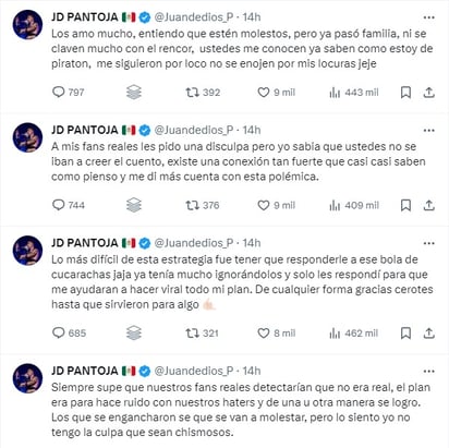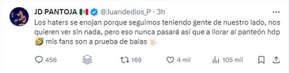 Juan de Dios Pantoja ha hecho además varias publicaciones en la red social X, en donde se ha lanzado en contra las críticas que han recibido luego de revelar cómo mintieron a sus fans, además de que sus propios fans se han lanzado en contra.