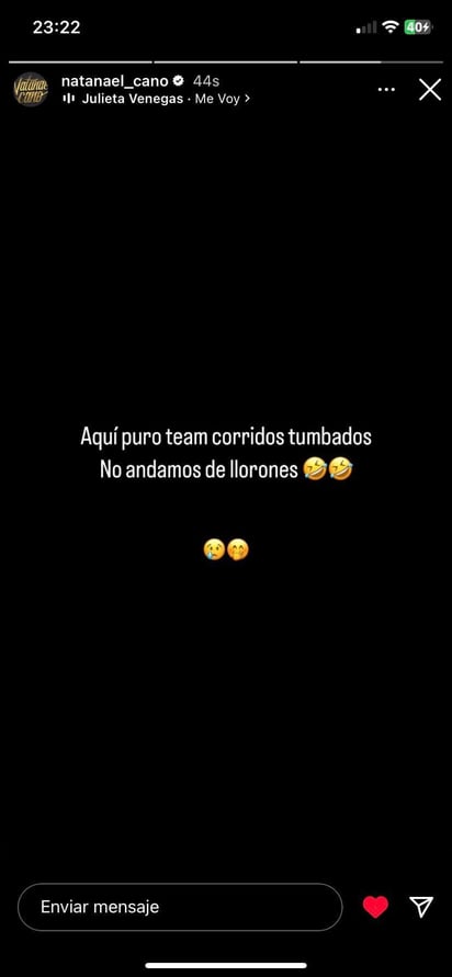 “Aquí puro team corridos tumbados no andamos de llorones”, puso junto a unas risas en emoji y cara triste, sin embargo, su publicación fue eliminada minutos después.