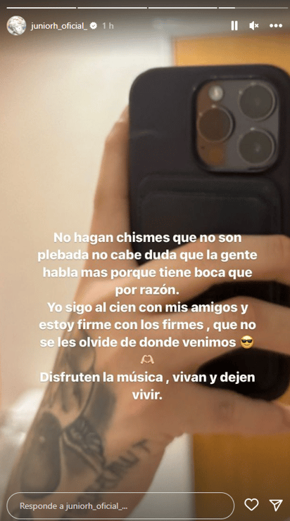 “No hagan chismes que no son plebada no cabe duda que la gente habla más porque tiene boca que por razón. Yo sigo al cien con mis amigos y estoy firme con los firmes, que no se les olvide de donde venimos. Disfruten la música, vivan y dejen vivir”.