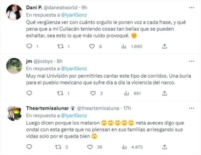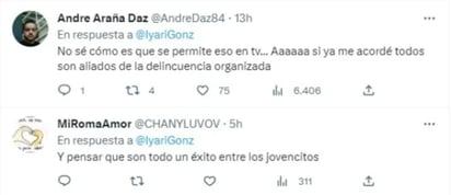 Los usuarios no dejaron pasar el hecho y dejaron sus comentarios: “No sé cómo se permite eso en tv… Aaaa si ya me acordé, todos son aliados de la delincuencia organizada”; “y pensar qué son todo un éxito entre los jovencitos”; “Así es, yo cambié de canal cuando escuché bien la canción, es increíble que hayan dejado cantar eso”; “´por tipos como estos seguimos siendo considerados de 3er mundo”.