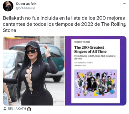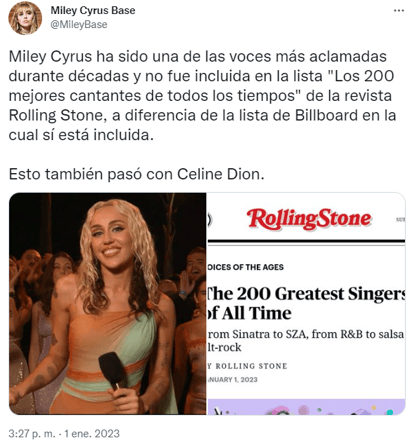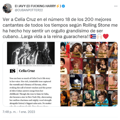 Antes de entrar el top 20, figuraron (58) Lady Gaga, Mick Jagger (52), Ariana Grande (43), Kurt Cobain (36) , Paul McCartney (26) y Adele(22); mientras en Celia Cruz, como parte de las cantantes del género tropical, fue la número 18, calificando de “rico” su tono de voz y resaltando el poder de sus temas santeras afrocubanas. “Podía capturar la nostalgia o lanzar un grito de ¡Azúcar! y encargar la exuberancia por la vida”.
