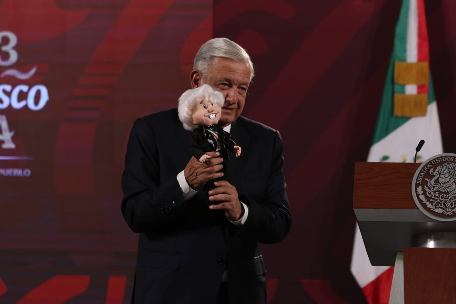 En el Salón Tesorería, López Obrador presionó entre risas el botón del muñeco para que hablara y se escucharon las frases: "Lo que diga mi dedito" y "me canso ganso".