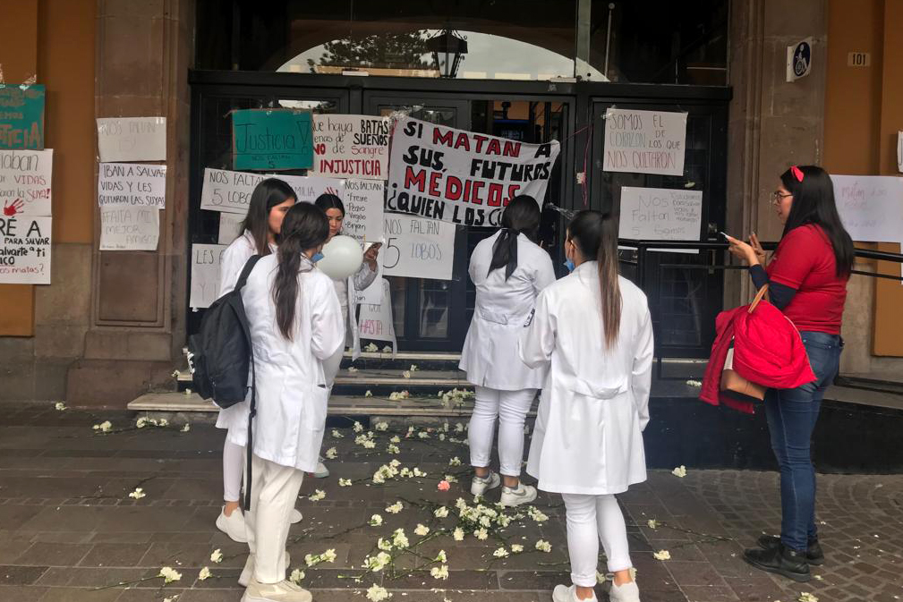 En las manos llevaban claveles y globos blancos, así como cartulinas con las siguientes leyendas: "Si matan a sus futuros médicos, ¿quién los cuidará?", "Estudian para salvar vidas y les quitaron la suya", "Entré a Medicina para salvar vidas y salvarte a ti México", "¿Por qué nos matan?", "Les arrancaron los sueños y la vida", "No somos todos, nos faltan 5", "Quiero perseguir mis sueños sin huir de la muerte", expresaron.