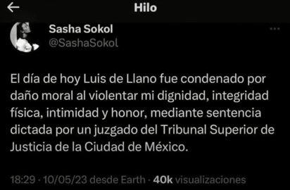 "Luis de Llano fue condenado por daño moral al violentar mi dignidad, integridad física, intimidad y honor, mediante sentencia dictada por un juzgado del Tribunal Superior de Justicia de la Ciudad de México", comentó Sasha en ese momento.