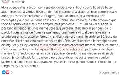 Su vida cambió a raíz de esa enfermedad y aunque "ya había cosas que estaban mal", esto detonó que se complicara más, según dice en su publicación en la que ofrece mamelucos y arreglos florales a cambio de comida.