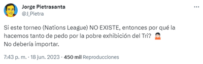 "Si este torneo (Nations League) NO EXISTE, entonces ¿por qué la hacemos tanto de pedo por la pobre exhibición del Tri? No debería importar", se lee en Twitter.