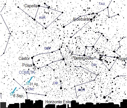 Trigo explica que a principios de septiembre está entrando en la constelación de Cáncer, procedente de la de Géminis, y todavía puede encontrarse trazando una línea hacia el horizonte desde sus dos estrellas más brillantes, Cástor y Pólux.
