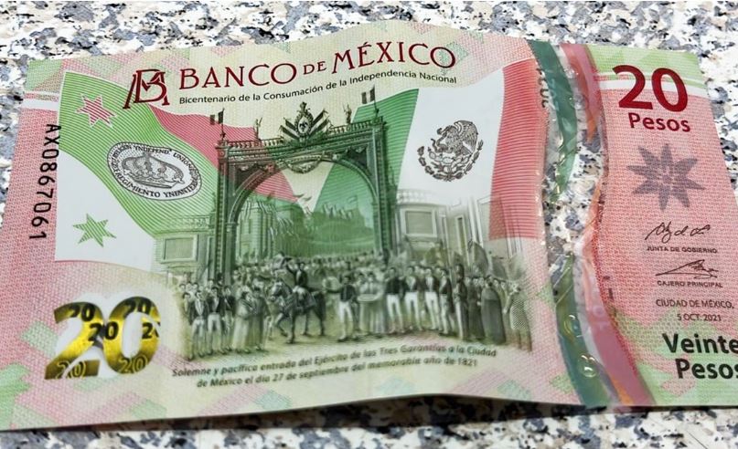 Se trata del nuevo billete de 20 pesos elaborado en polímero multicolor predominantemente verde y rojo de la familia G conmemorativo del Bicentenario de la Consumación Independencia.