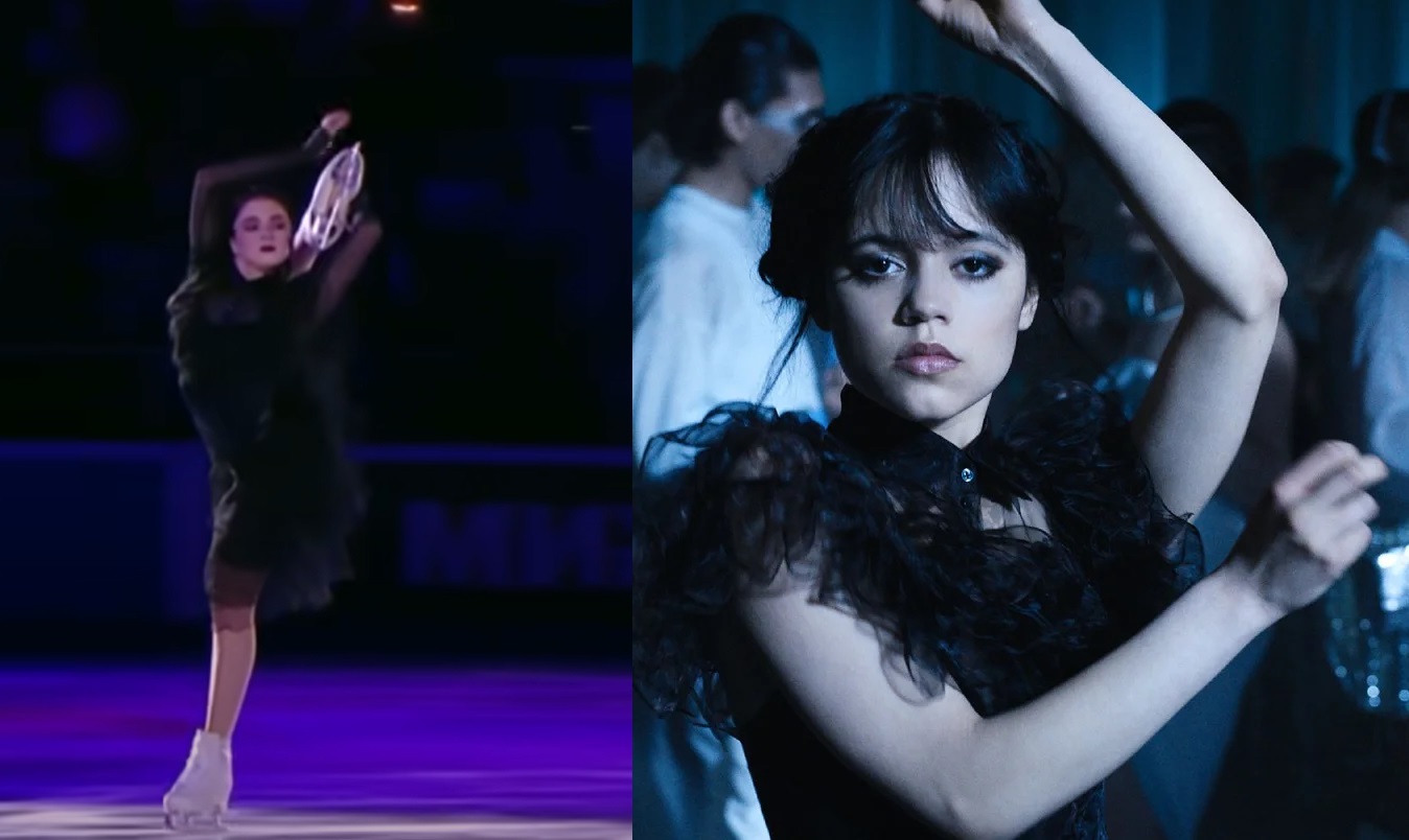 Valieva participó en el Campeonato Ruso de Partinaje Artístico, durante su rutina recreó el baile que hizo la actriz Jenna Ortega en la serie de "Merlina", de inmediato los asistentes le reconocieron su creatividad con aplausos.