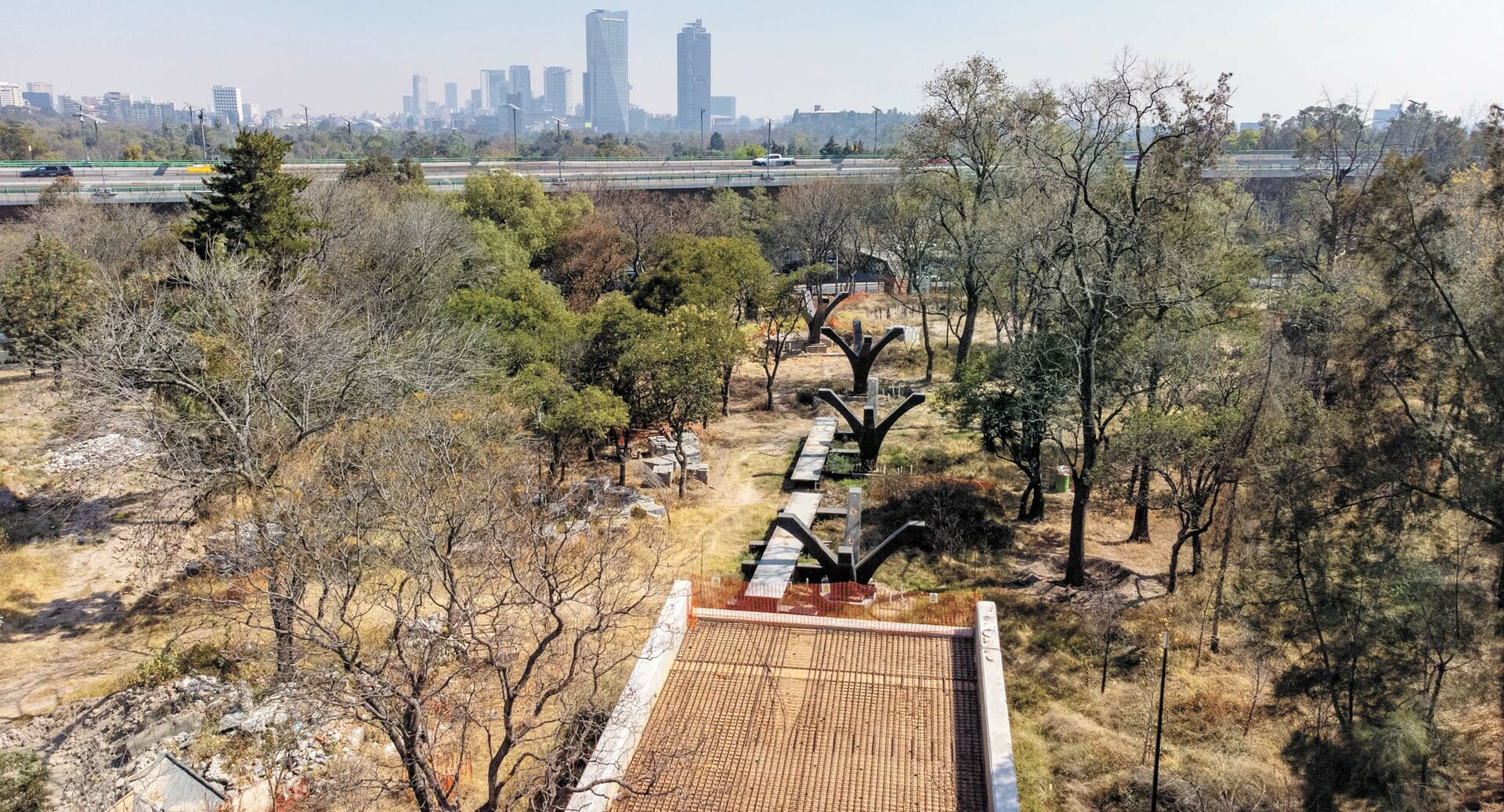 El camino sigue: al cruzar el proyecto de Orozco, un par de metros dentro de la ciclovía, hay una imagen panorámica de lo que será el Parque Aztlán. La historia es conocida y no hace falta recapitularla: los últimos días de septiembre de 2019, un carro de la montaña rusa Quimera, juego nuevo de la ya enterrada Feria de Chapultepec, se descarriló. Dos jóvenes murieron y el accidente dio pie al desmantelamiento de todo el complejo, un estatus en el limbo que llevó a la regeneración del proyecto. Fue en julio de 2021 cuando empezó a construirse el Parque Urbano Aztlán a cargo de Mota Engil México —que también está a cargo del primer tramo de 228km del Tren Maya—, con una inversión de 3 mil 639 millones de pesos.