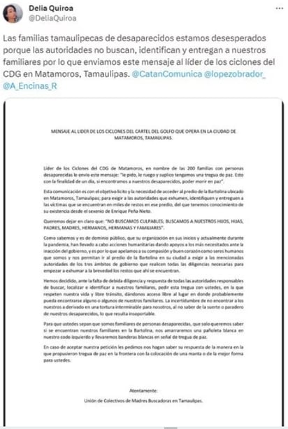 En julio de 2021, la Unión de Colectivo de Madres Buscadoras en Tamaulipas solicitó una tregua para acceder al predio de la Bartolina, ubicado en Matamoros, y proteger sus vidas durante las jornadas de búsqueda.