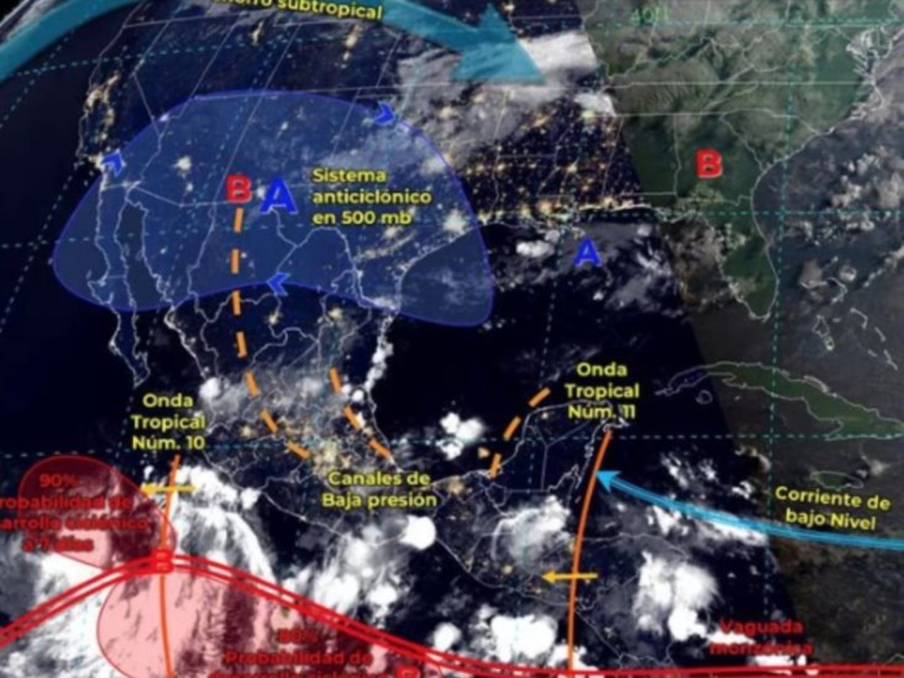 La onda tropical número 11 se desplazará sobre el sureste mexicano y se asociará con una zona de baja presión con probabilidad de desarrollo ciclónico al sur de las costas de Chiapas y Oaxaca; ambos sistemas interaccionarán con un canal de baja presión extendido sobre el oriente del país y con el ingreso de humedad del Mar Caribe y Golfo de México, propiciando lluvias fuertes a muy fuertes, descargas eléctricas y rachas de viento en las regiones mencionadas, además del sur del territorio nacional, así como lluvias puntuales intensas en Chiapas, Oaxaca y Guerrero.