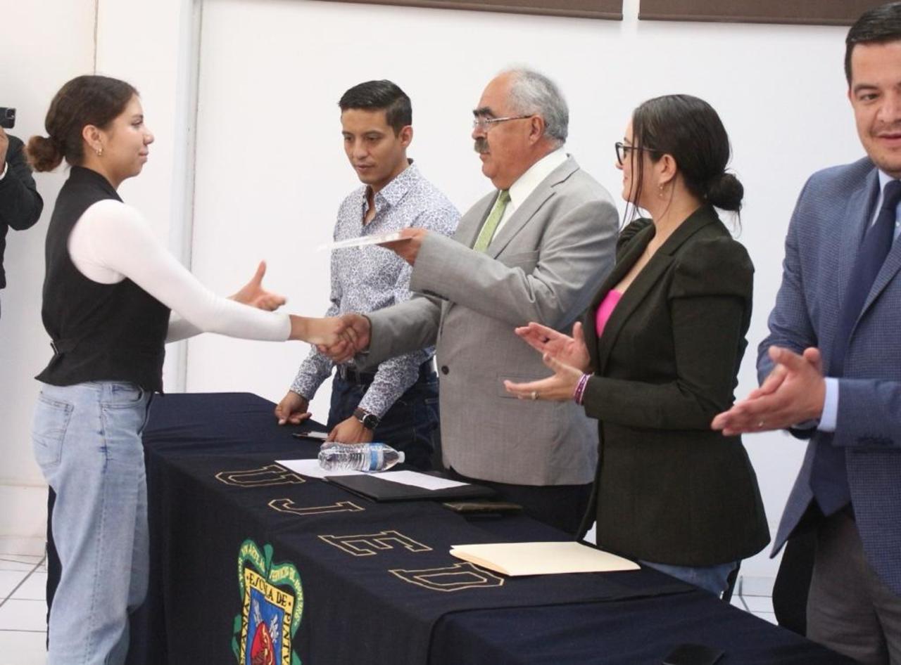 Rubén Solís Ríos, rector de la Universidad Juárez del Estado de Durango (UJED), acompañado por la directora de la Escuela de Pintura, Escultura y Artesanías (EPEA), Claudia Goretti Moncisvais Martínez, presidió la toma de protesta del nuevo Comité Ejecutivo de Sociedad de Alumnos (CESA), que encabeza Cristian Osiris Barrientos Machado.