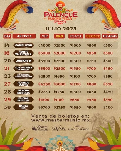 Aunque todavía no se anuncia cuándo comenzará la venta de boletos, se dio a conocer que esta se realizará en línea y en algunos puntos físicos distribuidos en la ciudad de Durango.