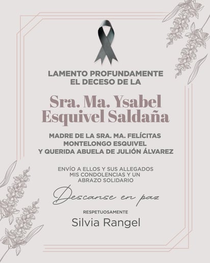 “Con profundo cariño y respeto, me uno a la pena que embarga a la familia de Doña María Ysabel Esquivel Saldaña, ante su lamentable deceso. En especial, abrazo con afecto a la señora María Felícitas Montelongo Esquivel y a su hijo, nuestro amigo Julión Álvarez, a quienes deseamos una pronta resignación ante esta irreparable pérdida”, agregó en Facebook.