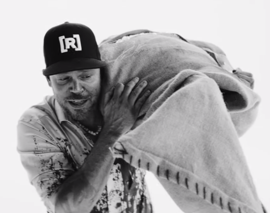 Así, el video continúa con Residente desnudándose y volviendo a su personaje de rapero usando su característico sombrero con la letra "R".