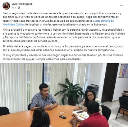 Este hecho aparentemente dio resultado, pues al siguiente día el conductor fue identificado y llevado con las autoridades correspondientes quienes le retiraron el gafete y la licencia de conducir, documentos que lo facultan para prestar el servicio de transporte público.