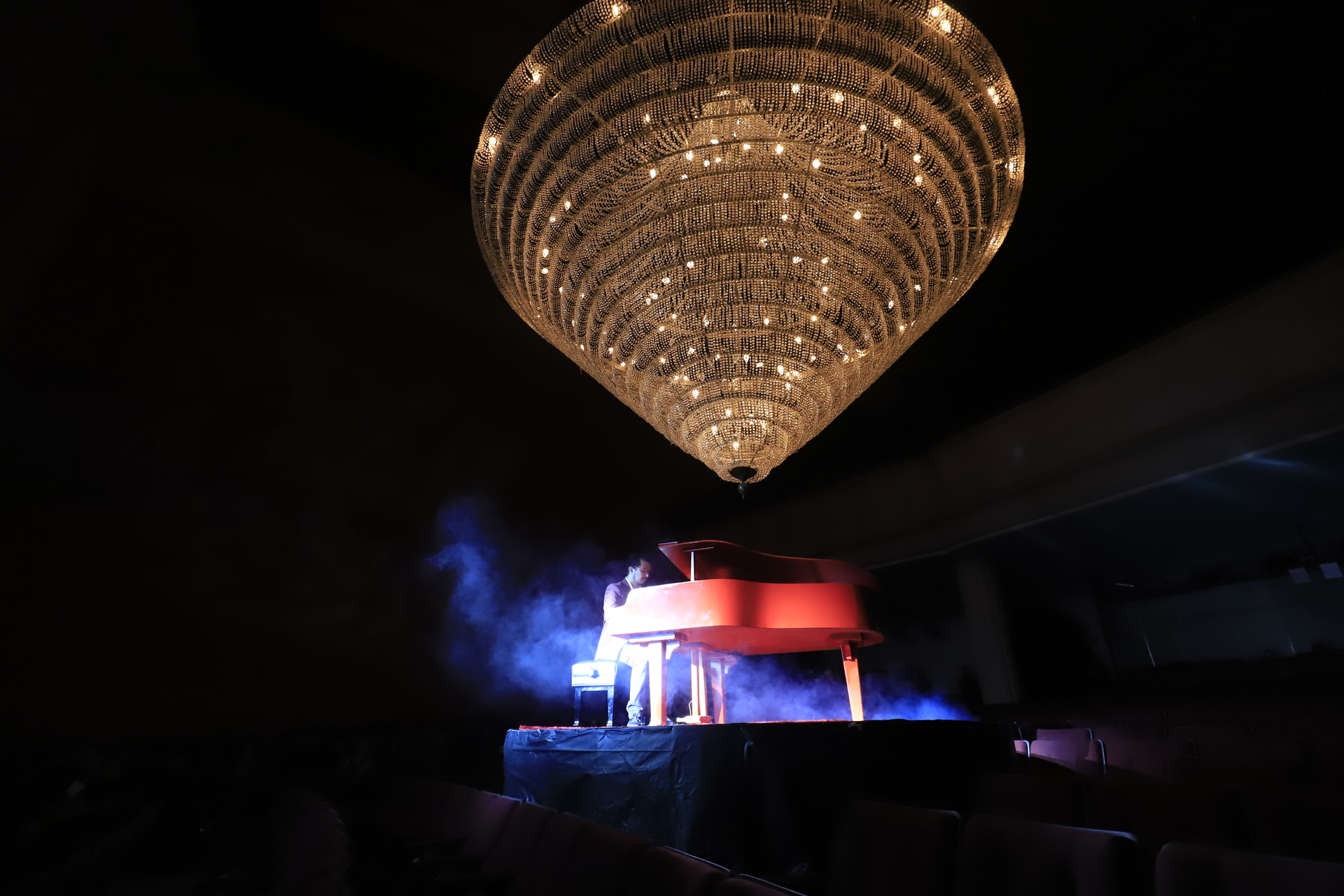La presentación, atípica a lo hecho en ocasiones anteriores, tuvo como escenario, literalmente, el escenario del Teatro Ricardo Castro, donde se montó un recorrido por la oscuridad para develar a los artistas que formarán parte de la oferta cultural del festival, acompañados de una perfomance artístico de danza aérea y un solo de piano.