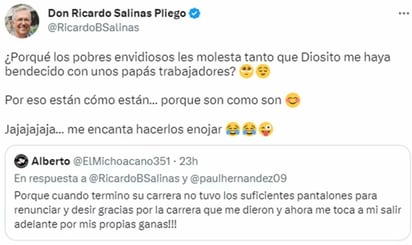 “¿Por qué a los pobres envidiosos les molesta tanto que Diosito me haya bendecido con unos papás trabajadores? Por eso están cómo están… porque son como son. Jajajajaja… me encanta hacerlos enojar”, se lee en el tuit del empresario.