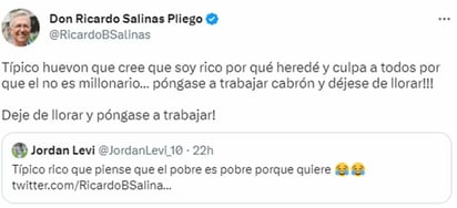 Aunado a ello, el dueño de TV Azteca se lanzó contra un segundo usuario que lo cuestionó por heredar la fortuna. “Típico huevón que cree que soy rico por qué heredé y culpa a todos porque él no es millonario… ¡¡¡póngase a trabajar cabrón y déjese de llorar!!! ¡Deje de llorar y póngase a trabajar!”.