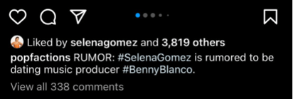 Todo comenzó cuando en una publicación, la cuenta de noticias PopFaction informó que ambos artistas estaban saliendo, a la que, para sorpresa de muchos, Selena le dio "me gusta".