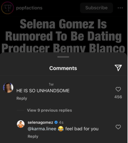 Las acciones por parte de Gómez no pararon, ya que, en una publicación del mismo medio, las cuales fueron rescatadas por la revista ELLE, la cantante defendió al músico de los ataques que estaba recibiendo.