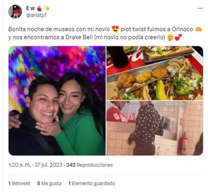 “Bonita noche de museos con mi novio. Plot Twist fuimos a Orinoco y nos encontramos a Drake Bell (mi novio no podía creerlo)”, se lee en la publicación de la usuaria @ariatpf. Aunque se desconoce en qué sucursal fue captado el cantante.