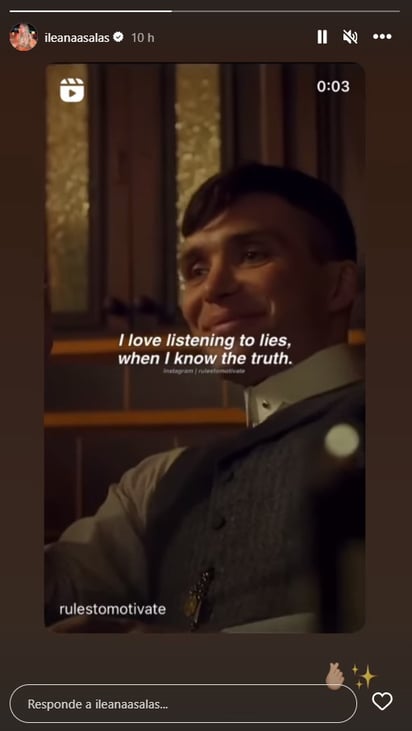 Hasta ahora, Ileana Salas no ha salido a desmentir la supuesta filtración de audio en la que se le relaciona, sin embargo, publicó un video en sus historias de Instagram en el que se lee: “I love listening to lies, when i know the truth” (Me encanta escuchar mentiras, cuando sé la verdad).