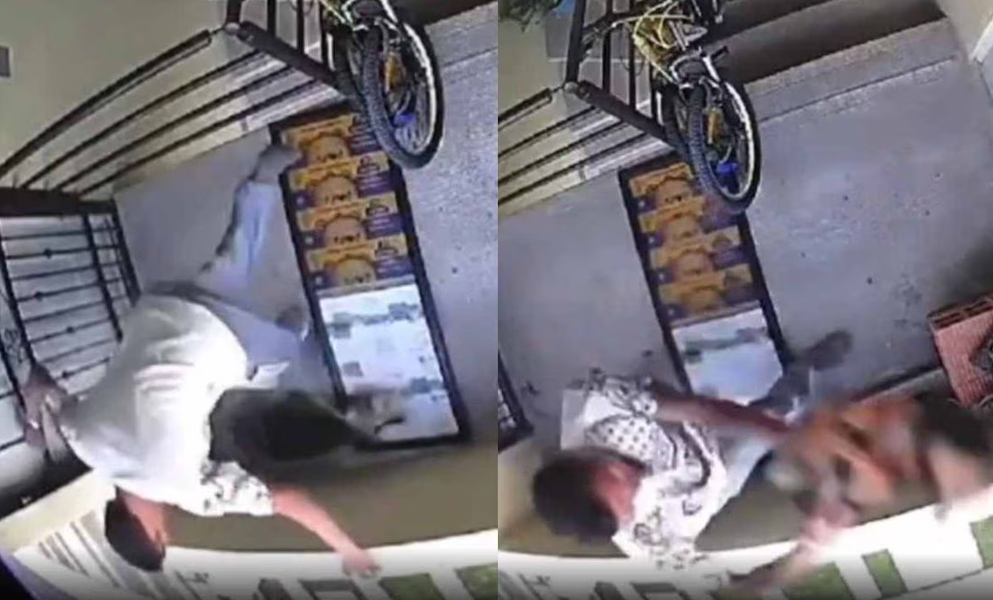 La cámara de seguridad capta el momento que el hombre sube las escaleras de manera sigilosa para romper la barda que tenía la perra cuando comenzó a patearla por lo menos cinco veces, azotarla y arrojarla hacia la ventana.