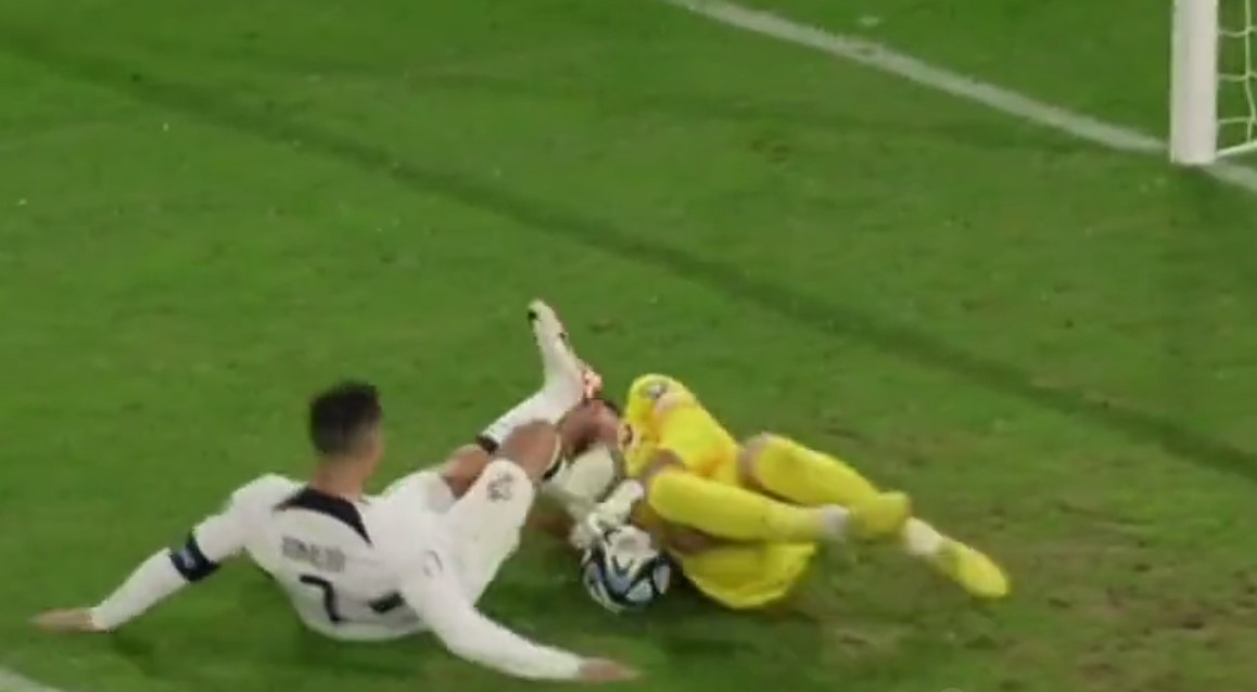 Cristiano Ronaldo estuvo a punto de ser expulsado debido a que, en su intento por empujar el balón al fondo de la portería, terminó por darle una patada en el rostro del arquero eslovaco.