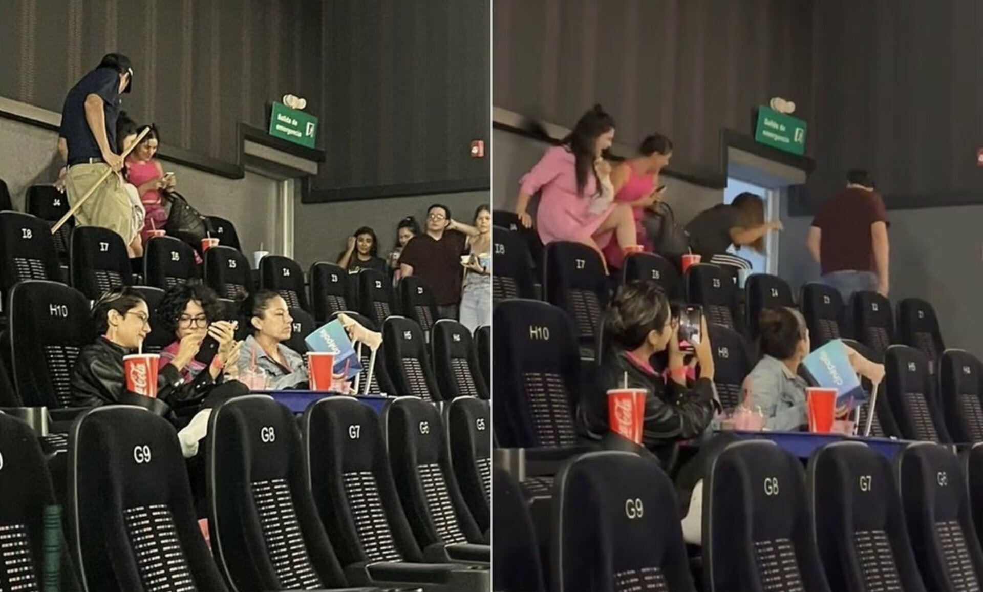 Asimismo, en la grabación se ve cómo el personal del cine trata de pegarle con una escoba para conseguir que se saliera.