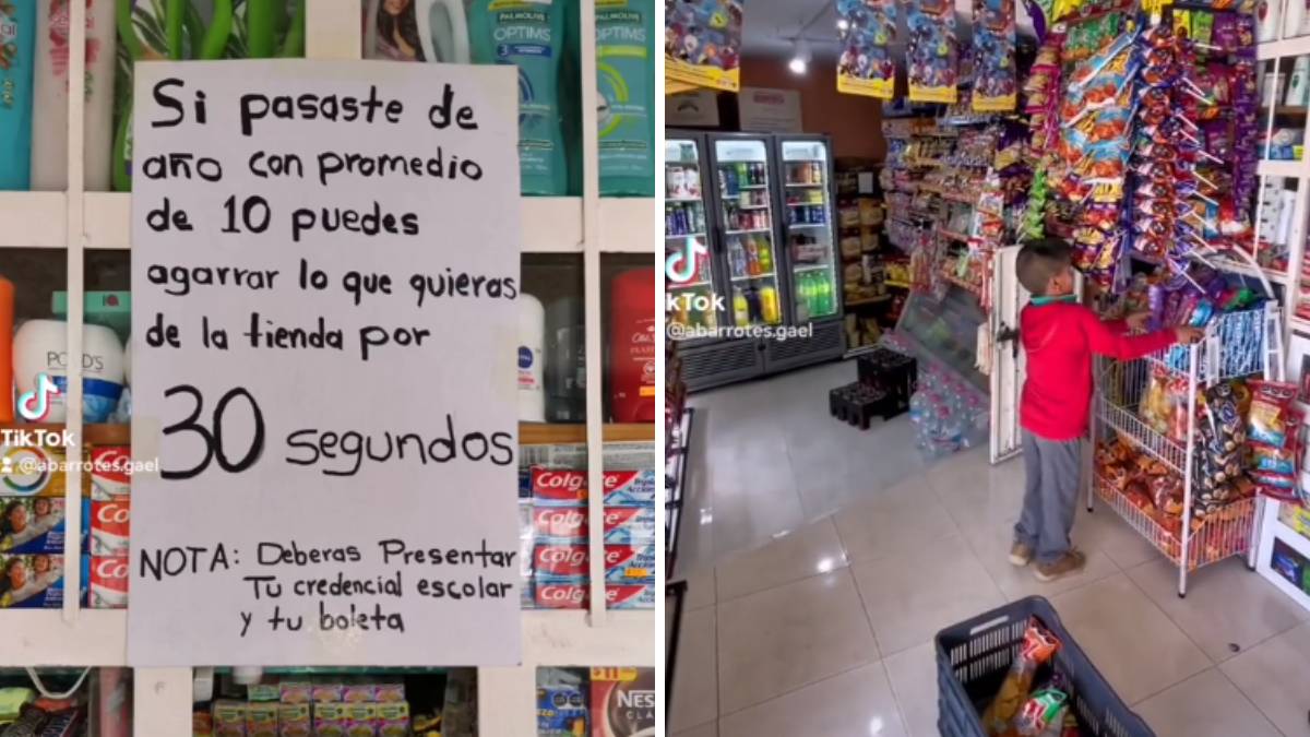 En el letrero se podía leer: "Si paste de año con promedio de 10, puedes agarrar lo que quieras de la tienda por 30 segundos. Nota: deberás presentar tu credencial y tu boleta".
